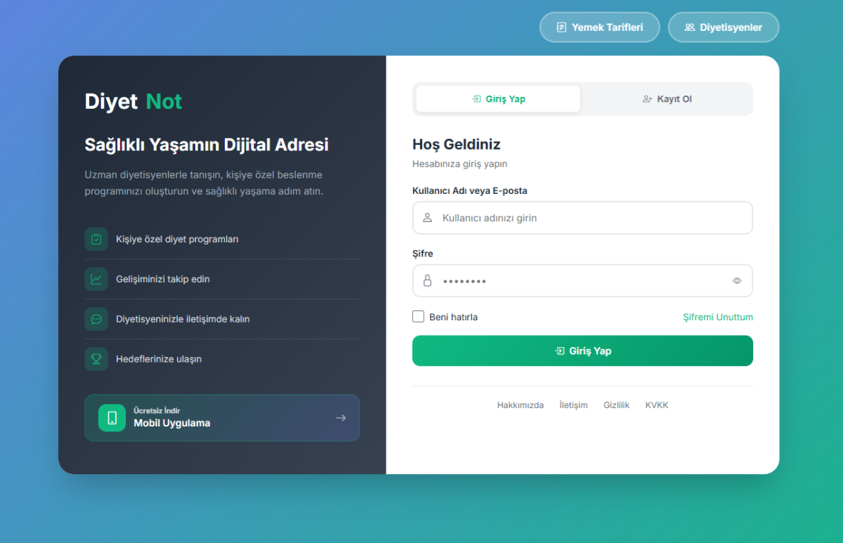 Diyetisyen Danışan Uygulaması Web platformunda çalışmaktadır. Versiyon 1.0 mevcuttur.